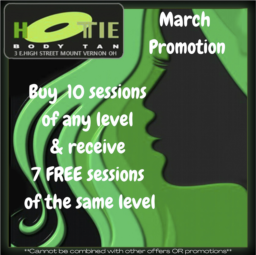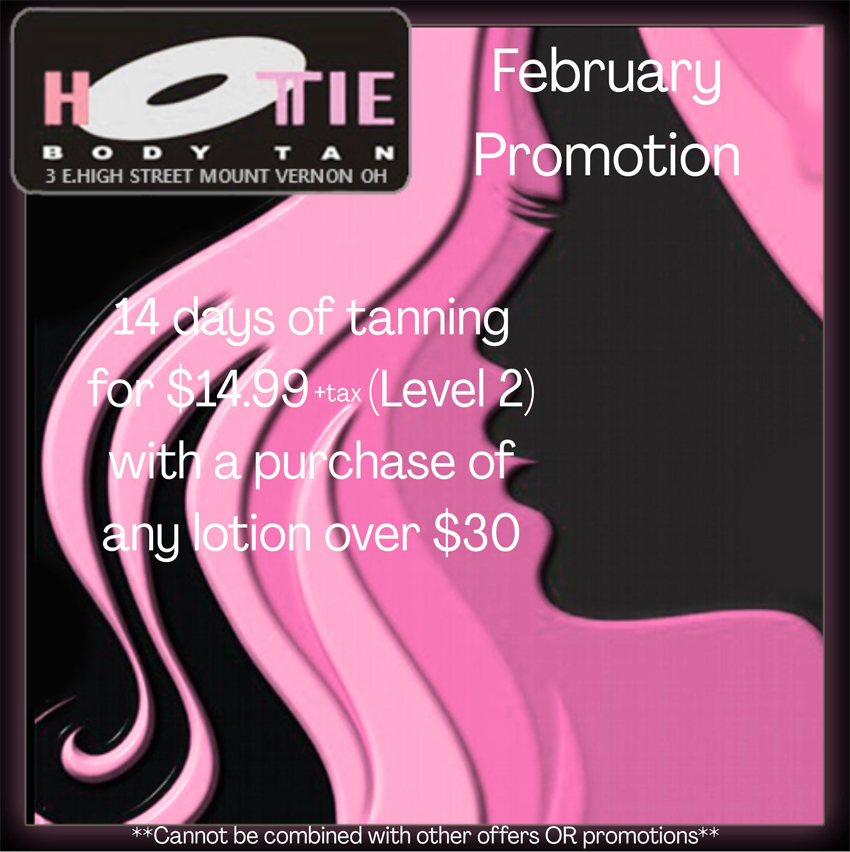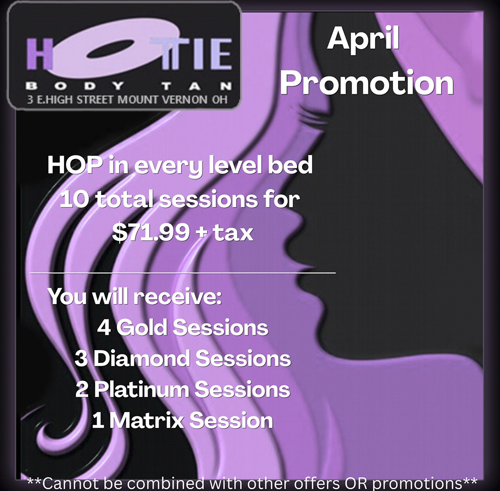 Hottie Body Tanning Salon is Mount Vernon Ohio's largest tanning salon. With the largest selection of tanning beds and tanning supplies. We offer monthly and daily deals and great specials on tanning supplies. We are located in Mount Vernon at 3 East High Street, Mount Vernon, OH 43050 right next to the Public Square.